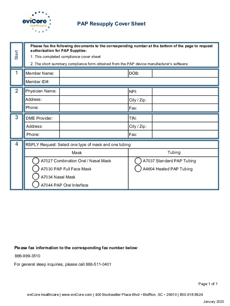 Start PAP Resupply Cover SheetPlease fax the following documents to the corresponding number at the bottom of the page to request authorization for PAP Supplies: 1. This completed compliance cover