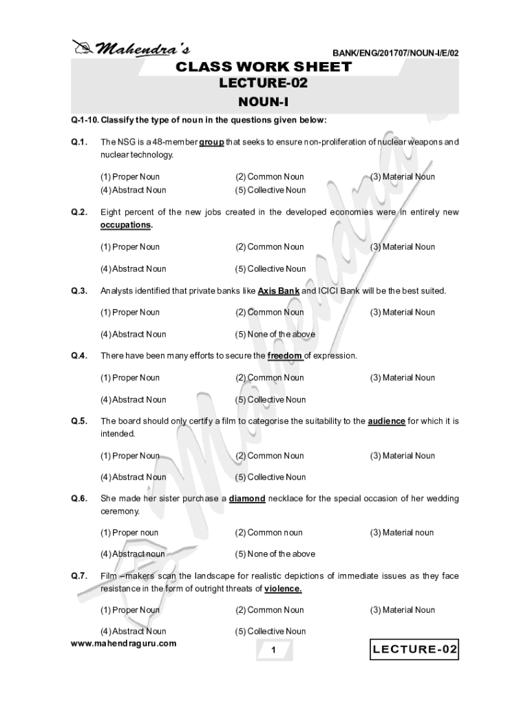 BANK/ENG/201707/NOUN/E/02CLASS WORK SHEET LECTURE02 NOUNIQ110. Classify the type of noun in the questions given below: Q.1. The NSW is a 48member group that seeks to ensure nonproliferation of nuclear