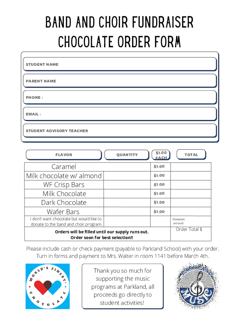 BAND AND CHOIR FUNDRAISER CHOCOLATE ORDER FORM STUDENT APPARENT TELEPHONE :EMAIL :STUDENT ADVISORY TEACHERFLAVOR$1.00 EACHQUANTITYCaramel Milk chocolate w/ almond WF Crisp Bars Milk Chocolate Dark