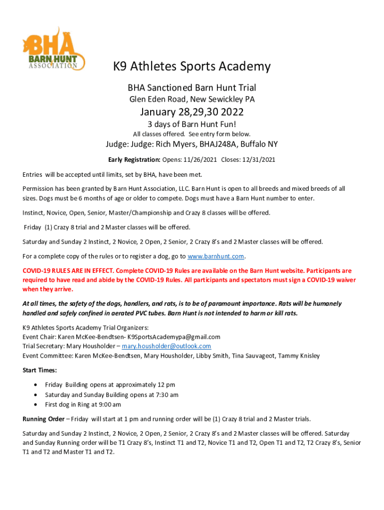 K9 Athletes Sports Academy BHA Sanctioned Barn Hunt Trial Glen Eden Road, New Sickle PA January 28,29,30 2022 3 days of Barn Hunt Fun! All classes offered. See entry form below. Judge: Judge: Rich