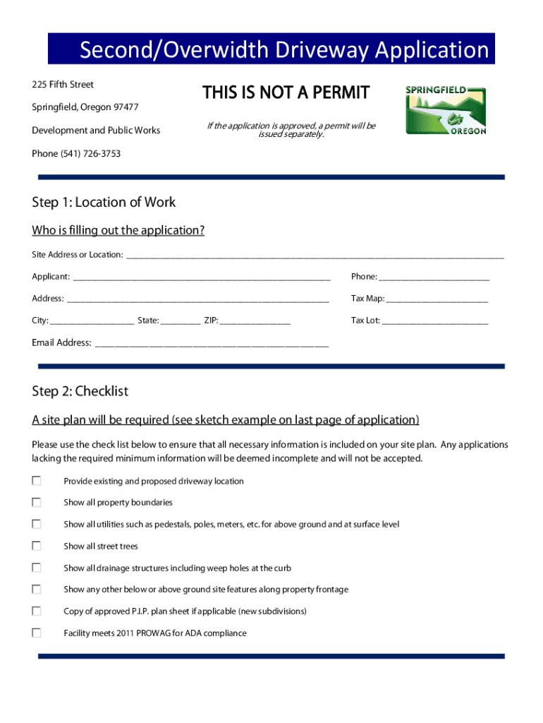 Second/OverwidthDrivewayApplication225 Fifth Streets IS NOT A PERMIT Springfield, Oregon 97477 Development and Public Works the application is approved, a permit will be issued separately. Phone (541)