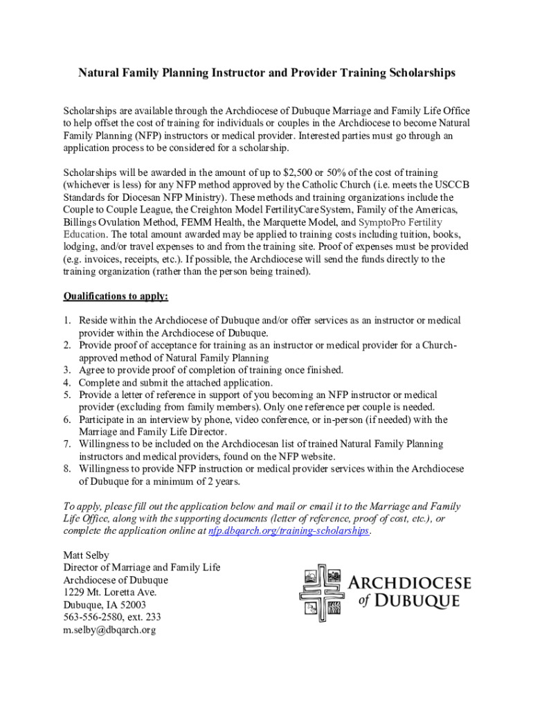 Natural Family Planning Instructor and Provider Training Scholarships are available through the Archdiocese of Dubuque Marriage and Family Life Office to help offset the cost of training for individuals