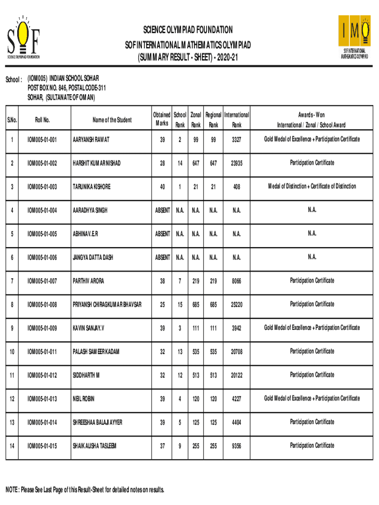 SCIENCE OLYMPIAD FOUNDATION OF INTERNATIONAL MATHEMATICS OLYMPIAD (SUMMARY RESULT SHEET) 202021 School :(IOM005) INDIAN SCHOOL SOLAR POST BOX NO. 846, POSTAL CODE311 SOLAR, (SULTANATE OF OMAN) Name