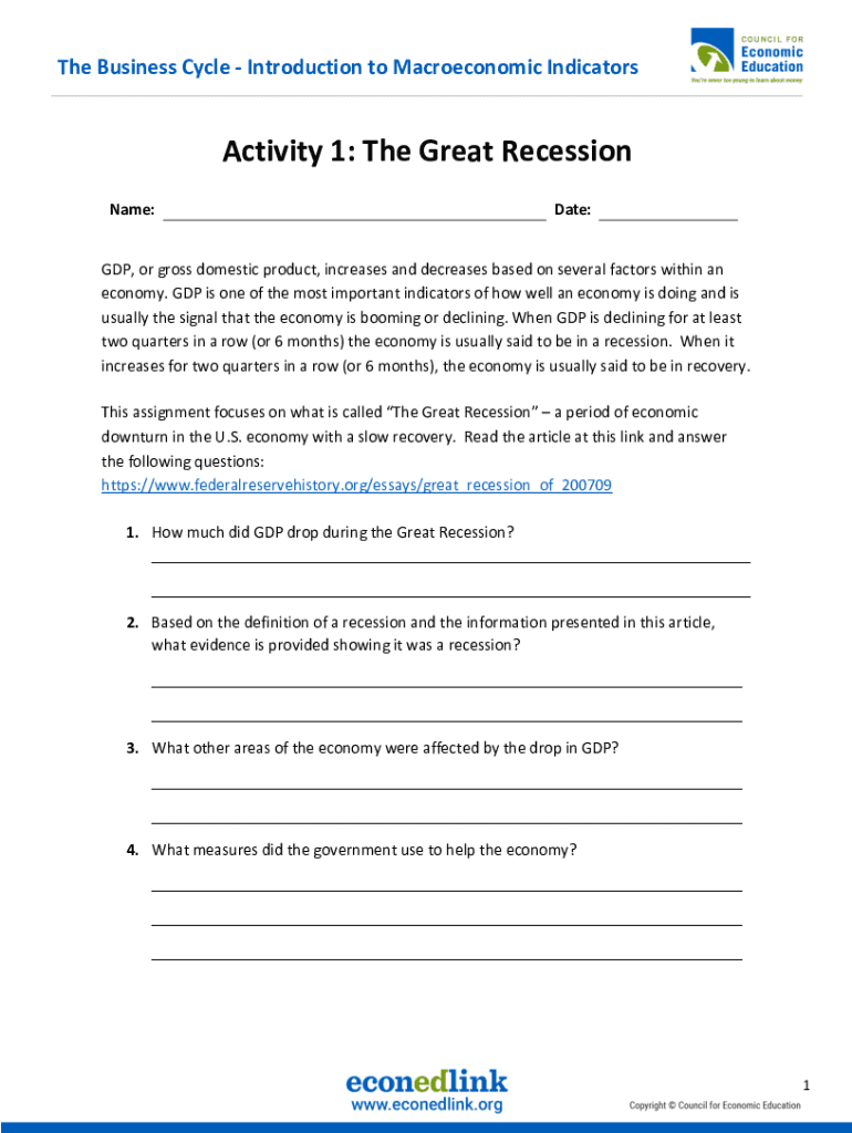 The Business Cycle Introduction to Macroeconomic IndicatorsActivity 1: The Great Recession Name:Date:GDP, or gross domestic product, increases and decreases based on several factors within an economy.