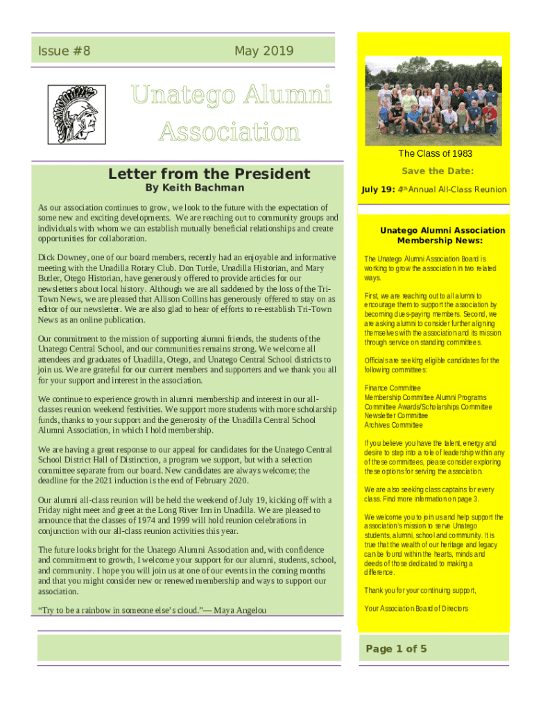 Issue #8May 2019Unatego Alumni Association The Class of 1983Letter from the President By Keith Bahamas our association continues to grow, we look to the future with the expectation of some new and