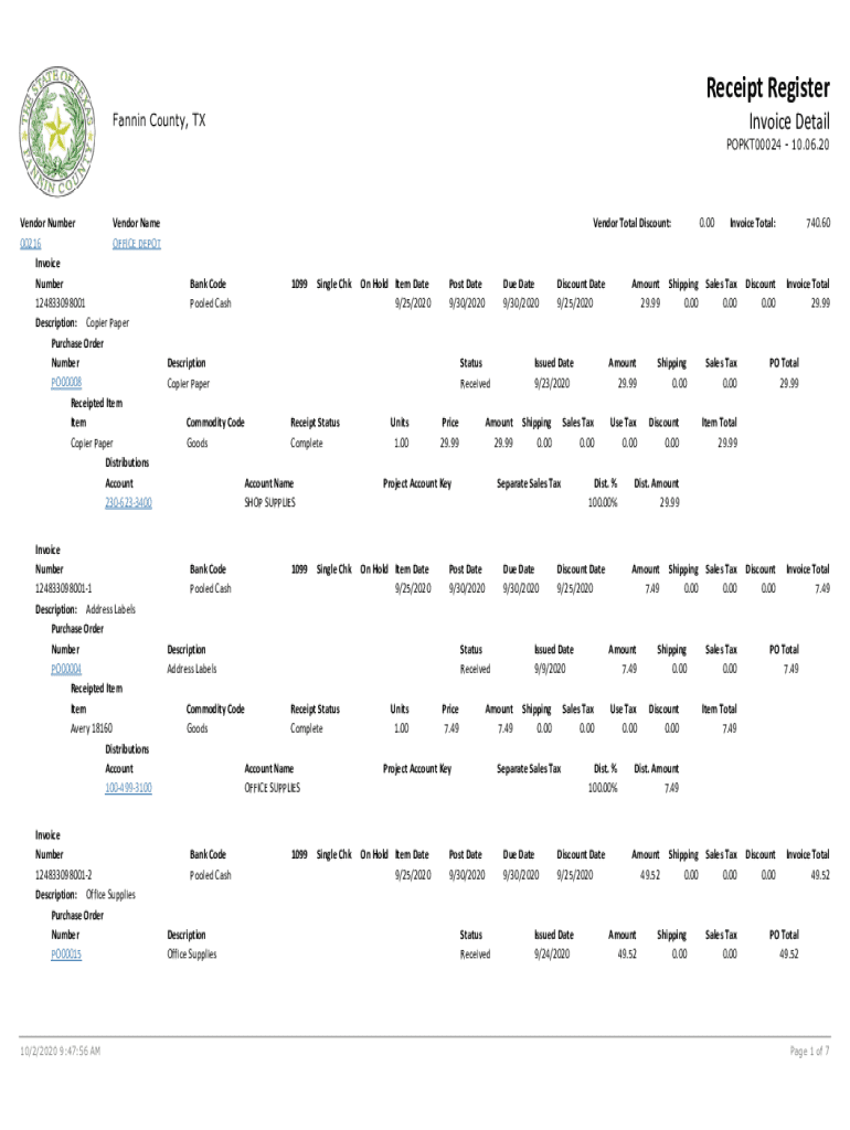 Receipt Register Invoice DetailFannin County, TXPOPKT00024 10.06.20Vendor Number Vendor Name 00216 OFFICE DEPOT Invoice Number Bank Code 1099 Single CHK 124833098001 Pooled Cash Description: Copier