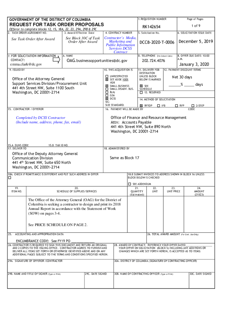 GOVERNMENT OF THE DISTRICT OF COLUMBIA1.REQUISITION NUMBERREQUEST FOR TASK ORDER PROPOSALS 3. Award/Effective Dateset Block 30C of Task Order After Awardee Task Order After Award7. FOR SOLICITATION