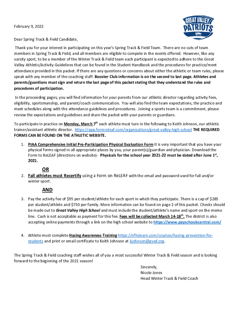 February 9, 2022, Dear Spring Track & Field Candidate, Thank you for your interest in participating on this year\'s Spring Track & Field Team. There are no cuts of team members in Spring Track & Field,