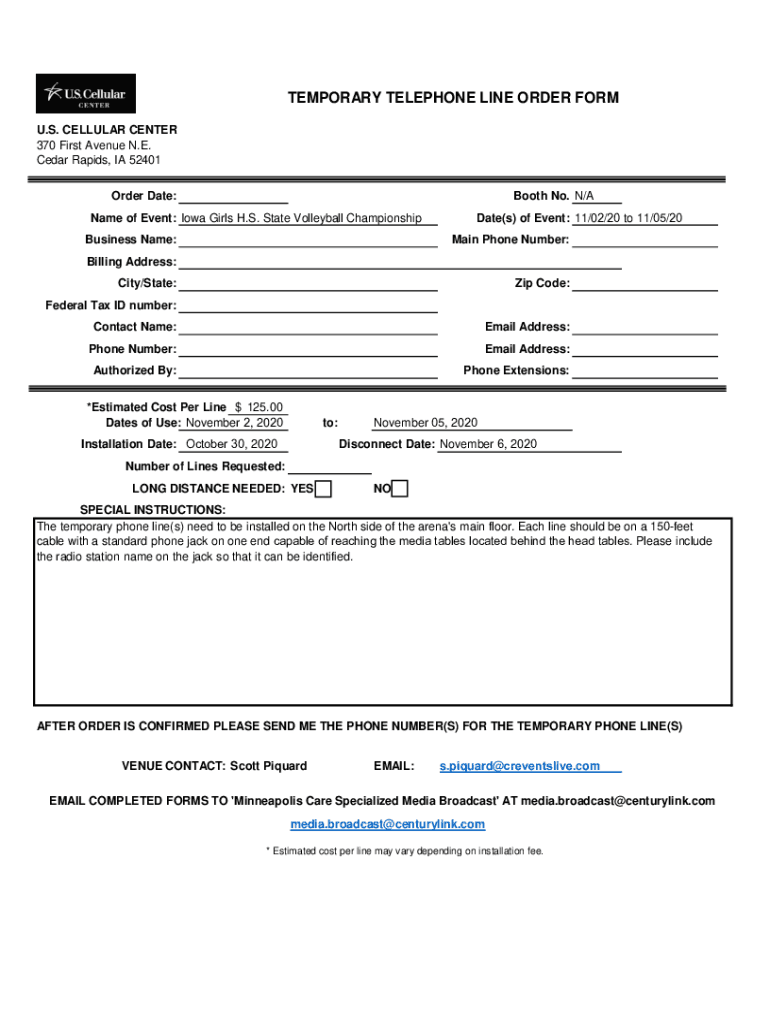 TEMPORARY TELEPHONE LINE ORDER FORM U.S. CELLULAR CENTER 370 First Avenue N.E. Cedar Rapids, IA 52401 Order Date:Booth No. N/Name of Event: Iowa Girls H.S. State Volleyball Championship Business Name:Date(s)