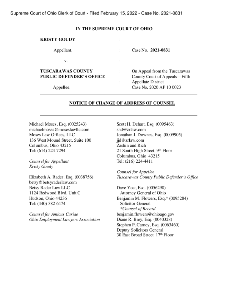 Supreme Court of Ohio Clerk of Court Filed February 15, 2022, Case No. 20210831IN THE SUPREME COURT OF OHIO KRISTY GAUDY Appellant, v.: :Case No. 20210831:TUSCARORAS COUNTY PUBLIC DEFENDERS OFFICE:On
