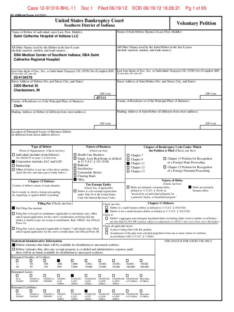 Case 1291316BHL11Doc 1Filed 06/19/12EOD 06/19/12 16:26:21Pg 1 of 65B1 (Official Form 1)(12/11)United States Bankruptcy CourtVoluntary PetitionSouthern District of Indiana b k 1 F o r m. V l u n t