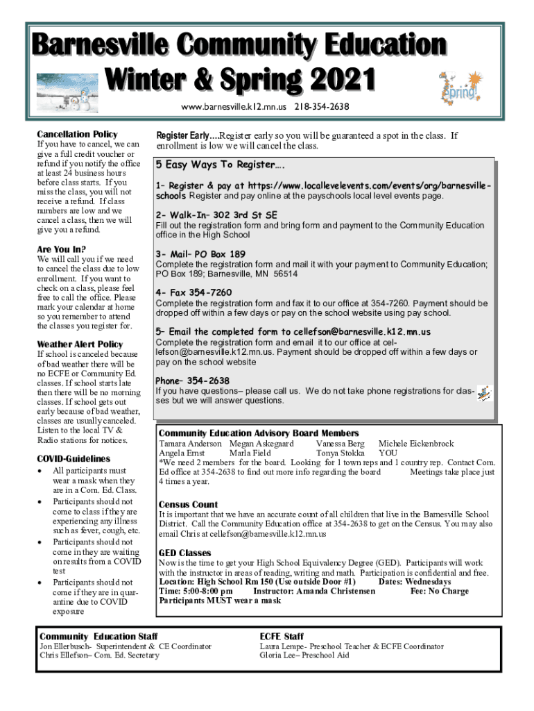 WWW. Barnesville.k12.MN.us 2183542638 Cancellation Policy If you have to cancel, we can give a full credit voucher or refund if you notify the office at least 24 business hours before class starts.