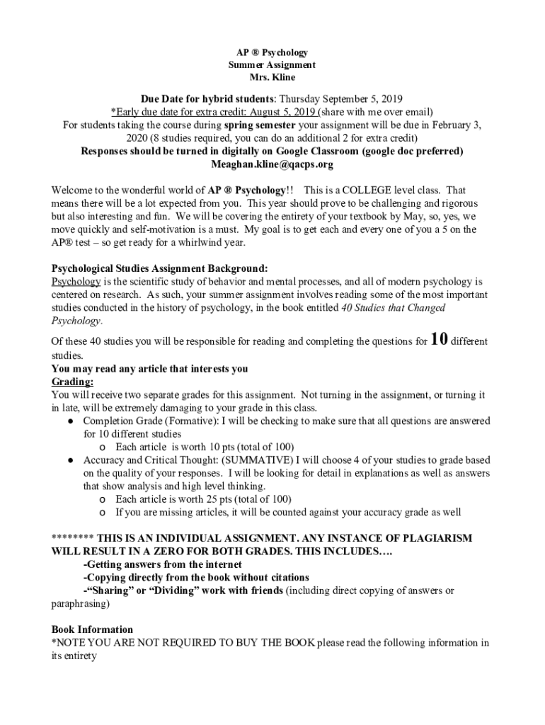AP Psychology Summer Assignment Mrs. Lineup Date for hybrid students: Thursday, September 5, 2019 *Early due date for extra credit: August 5, 2019 (share with me over email) For students taking the