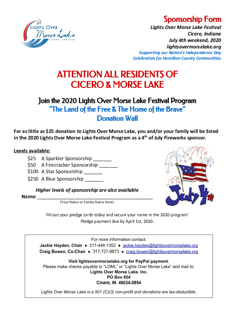 Sponsorship Form Lights Over Morse Lake Festival Cicero, Indiana July 4th weekend, 2020 lightsovermorselake.org Supporting our Nations Independence Day Celebration for Hamilton County CommunitiesATTENTION