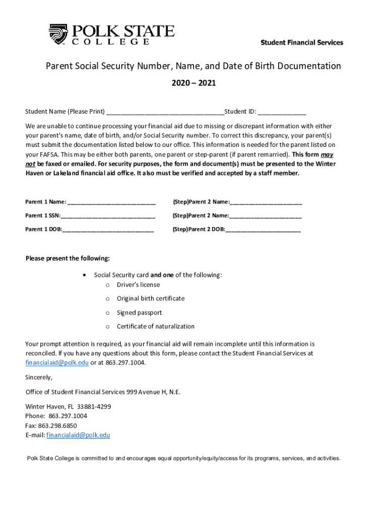Parent Social Security Number, Name, and Date of Birth Documentation 2020 2021 Student Name (Please Print) ___Student ID: ___ We are unable to continue processing your financial aid due to missing