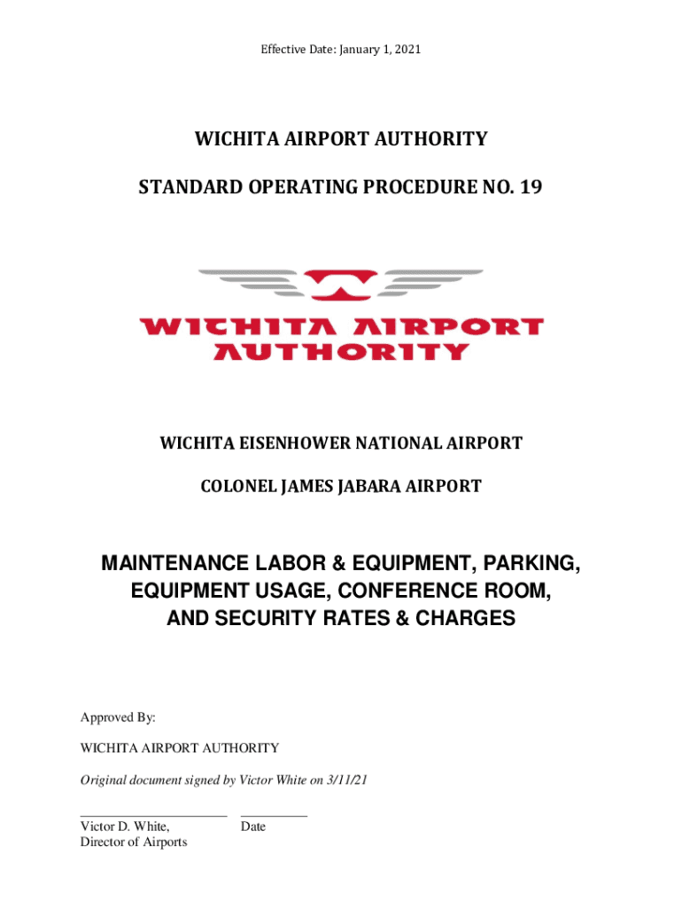 Effective Date: January 1, 2021WICHITA AIRPORT AUTHORITY STANDARD OPERATING PROCEDURE NO. 19WICHITA EISENHOWER NATIONAL AIRPORT COLONEL JAMES BARBARA AIRPORTMAINTENANCE LABOR & EQUIPMENT, PARKING,