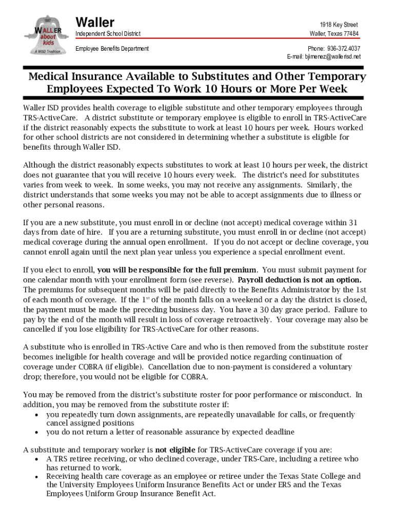 Email: bjimenez@wallerisd.netMedical Insurance Available to Substitutes and Other