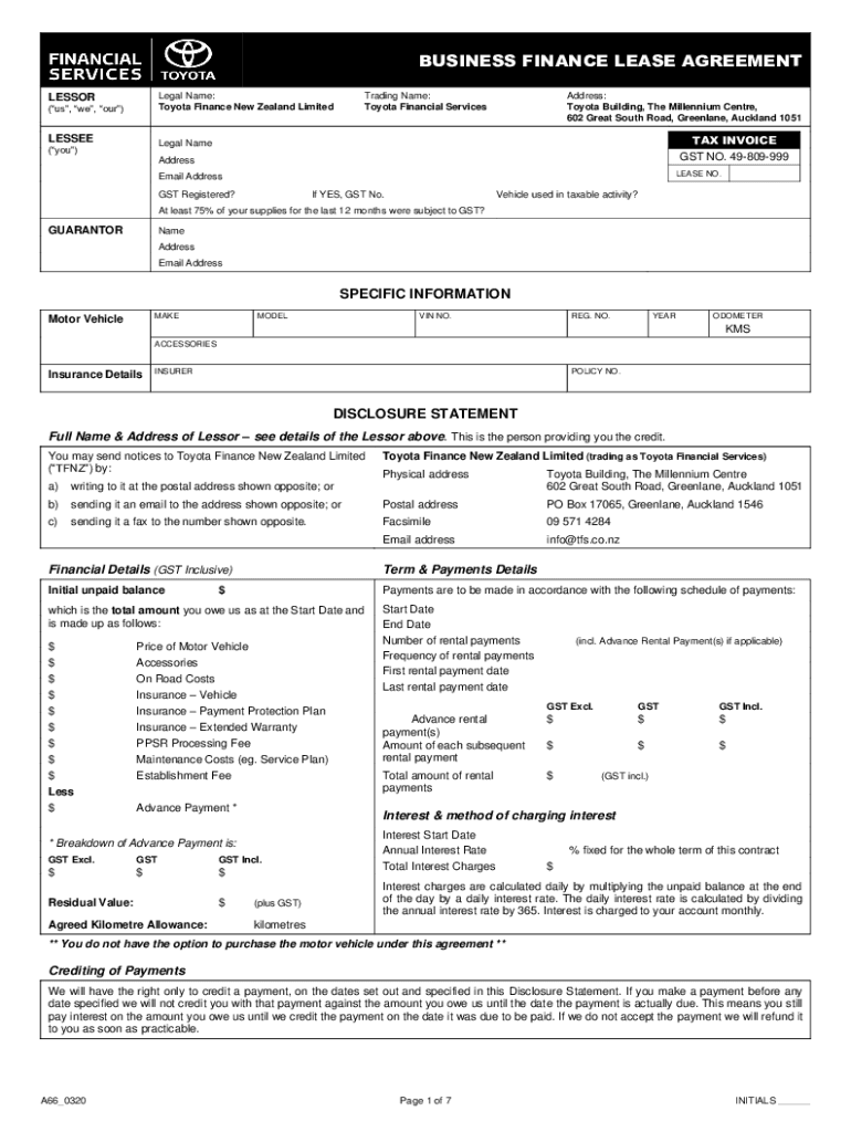BUSINESS FINANCE LEASE AGREEMENT (us, we, our)Legal Name: Toyota Finance New Zealand LimitedLESSEELegal Nameless OR(you)Trading Name: Toyota Financial ServicesAddress: Toyota Building, The Millennium