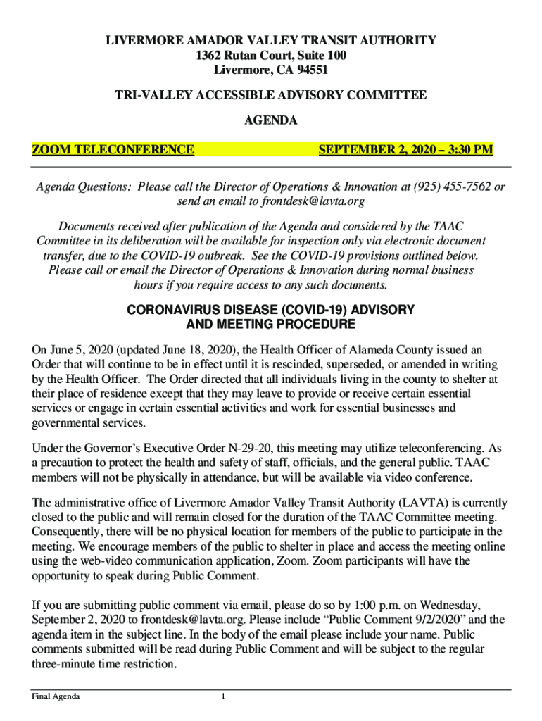 LIVERMORE AMADO VALLEY TRANSIT AUTHORITY 1362 Rutan Court, Suite 100 Livermore, CA 94551 TRIVIALLY ACCESSIBLE ADVISORY COMMITTEE AGENDA ZOOM TELECONFERENCESEPTEMBER 2, 2020 3:30 Agenda Questions: