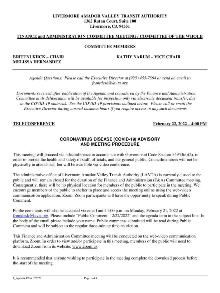 LIVERMORE AMADO VALLEY TRANSIT AUTHORITY 1362 Rutan Court, Suite 100 Livermore, CA 94551 FINANCE and ADMINISTRATION COMMITTEE MEETING / COMMITTEE OF THE WHOLE COMMITTEE MEMBERS BRITTANY KICK CHAIR