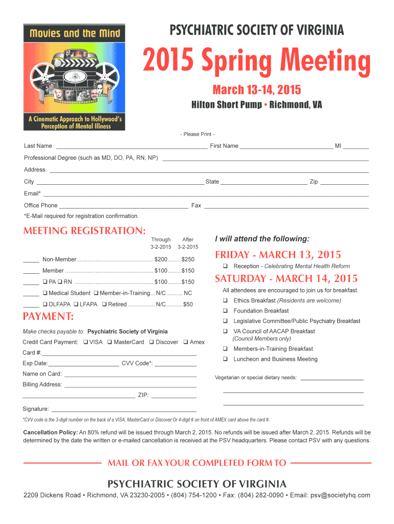 PSYCHIATRIC SOCIETY OF VIRGINIA 2015 Spring Meeting March 13-14, 2015 Hilton Short Pump Richmond, VA Please Print — Last Name First Name MI Professional Degree (such as MD, DO, PA, RN, NP) Address