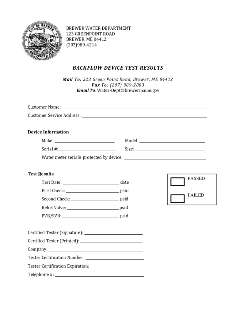 BREWER WATER DEPARTMENT 223 GUNPOINT ROAD BREWER, ME 04412 (207)9894214BACKFLOW DEVICE TEST RESULTS Mail To: 223 Green Point Road, Brewer, ME 04412 Fax To: (207) 9892883 Email To: WaterDept@brewermaine.gov