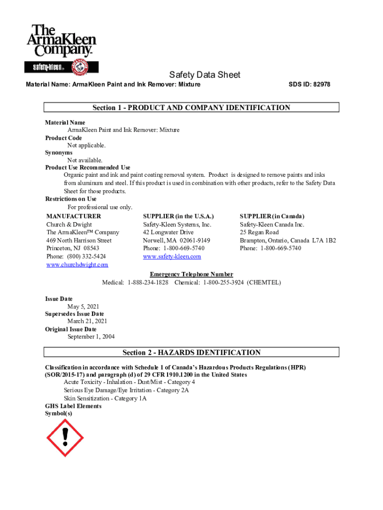 Safety Data Sheet Material Name: Arleen Paint and Ink Remover: Mixture SDS ID: 82978Section 1 PRODUCT AND COMPANY IDENTIFICATION Material Name Arleen Paint and Ink Remover: Mixture Product Code Not