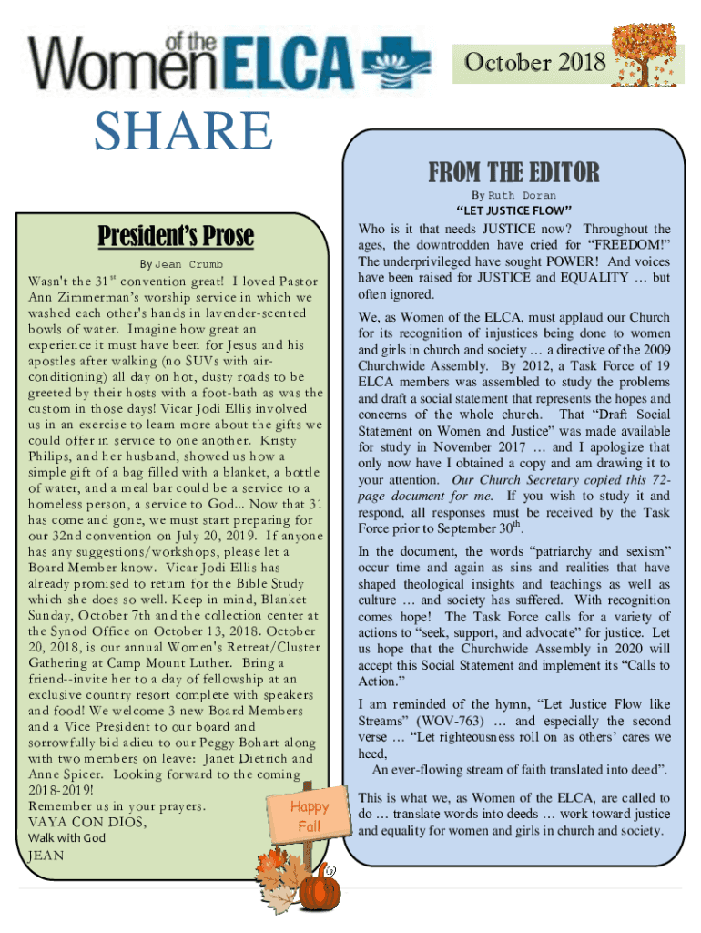 October 2018SHAREFROM THE EDITOR By Ruth Orange JUSTICE FLOWPresidents Prose By Jean Crumb strain\'t the 31 convention great! I loved Pastor Ann Zimmerman's worship service in which we washed each