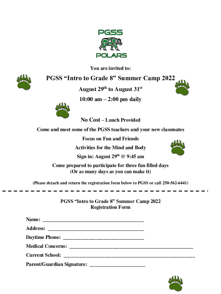 You are invited to:PASS Intro to Grade 8 Summer Camp 2022 August 29th to August 31st 10:00 am 2:00 pm daily No Cost Lunch Provided Come and meet some PASS teachers and your new classmates Focus on