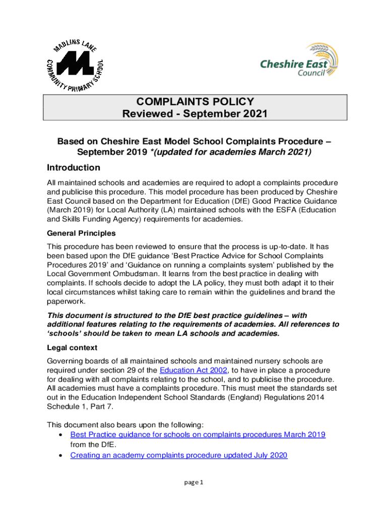COMPLAINTS POLICY Reviewed September 2021 Based on Cheshire East Model School Complaints Procedure September 2019 *(updated for academies March 2021) Introduction All maintained schools and academies