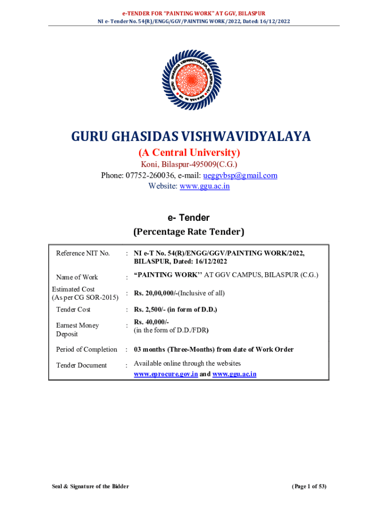 TENDER FOR PAINTING WORK AT GOV, BLASTER NI e Tender No. 54(R)/EGG/GOV/PAINTING WORK/2022, Dated: 16/12/2022Cover Pager HAIDAS VISHWAVIDYALAYA (A Central University) Kong, Bilaspur495009(C.G.) Phone: