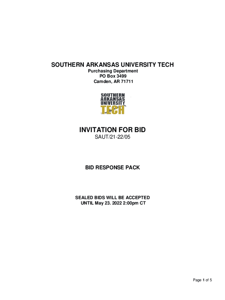 SOUTHERN ARKANSAS UNIVERSITY TECH Purchasing Department PO Box 3499 Camden, AR 71711INVITATION FOR BIDS AUT/2122/05BID RESPONSE PACKAGED BIDS WILL BE ACCEPTED UNTIL May 23. 2022 2:00pm CT Page 1 of