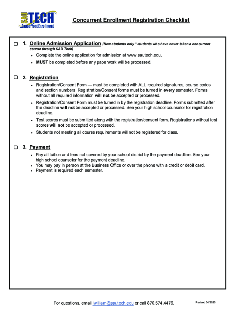 Concurrent Enrollment Registration Checklist1. Online Admission Application (New students only * students who have never taken a concurrent course through SAU Tech) Complete the online application
