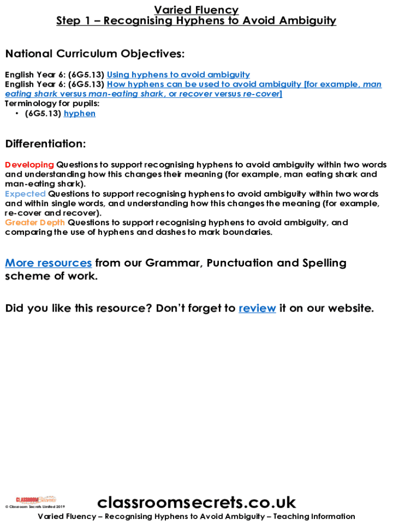 Varied Fluency Step 1 Recognizing Hyphens to Avoid Ambiguity National Curriculum Objectives: English Year 6: (6G5.13) Using hyphens to avoid ambiguity English Year 6: (6G5.13) How hyphens can be used
