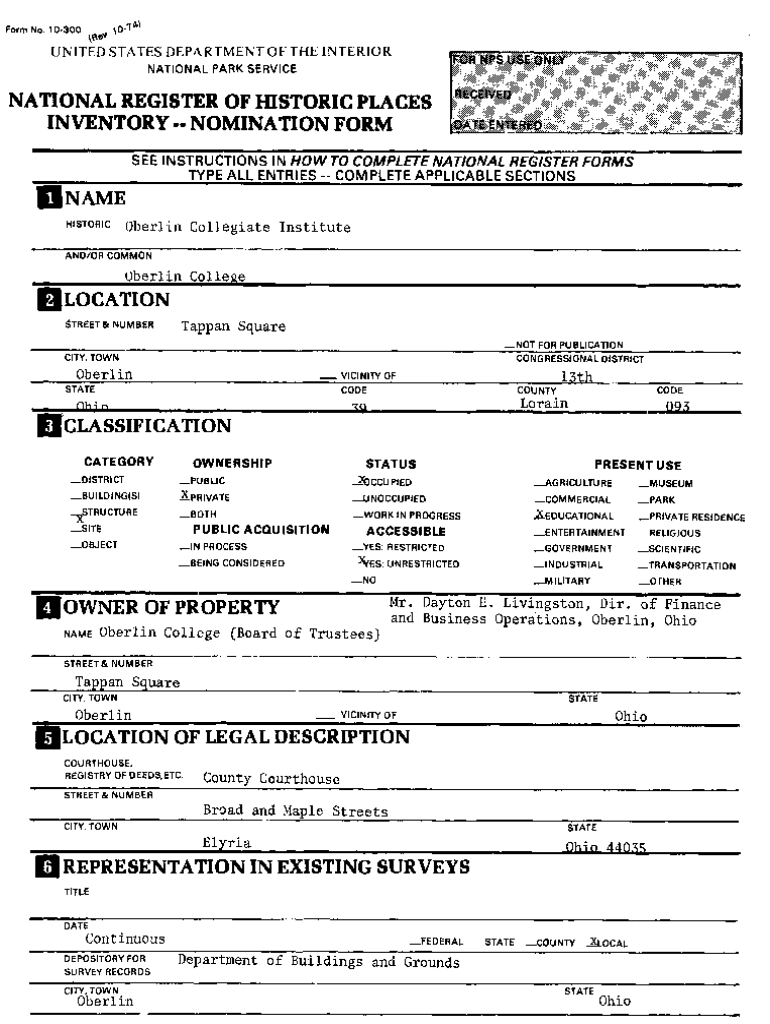 Form No. 10300 ex, 01UNITED STATES DEPARTMENT OF THE INTERIOR NATIONAL PARK SERVICENATIONAL REGISTER OF HISTORIC PLACES INVENTORY NOMINATION FORM SEE INSTRUCTIONS IN HO WTO COMPLETE NATIONAL REGISTER