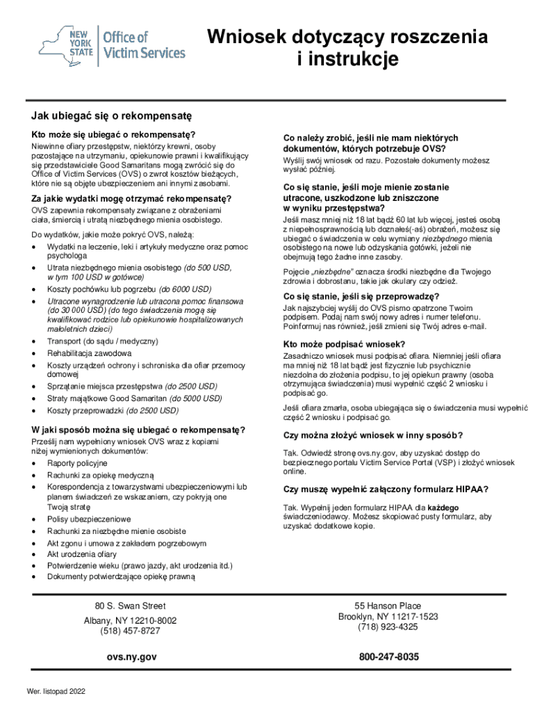 The NYS Office of Victim Services provides compensation to innocent victims of crime in New York State.