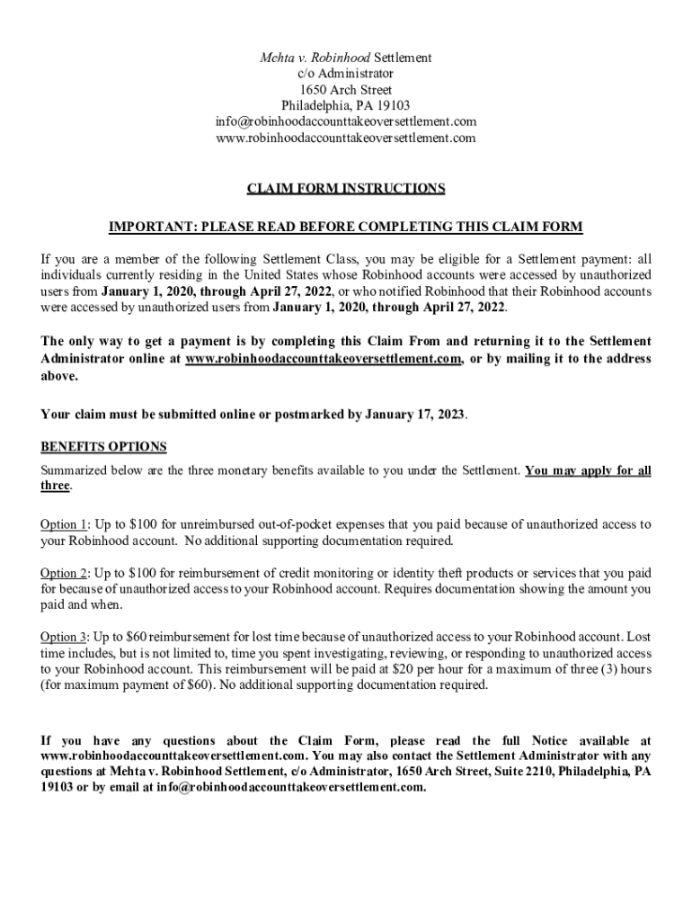 Meta v. Robinhood Settlement c/o Administrator 1650 Arch Street Philadelphia, PA 19103 info@robinhoodaccounttakeoversettlement.com www.robinhoodaccounttakeoversettlement.comCLAIM FORM INSTRUCTIONS