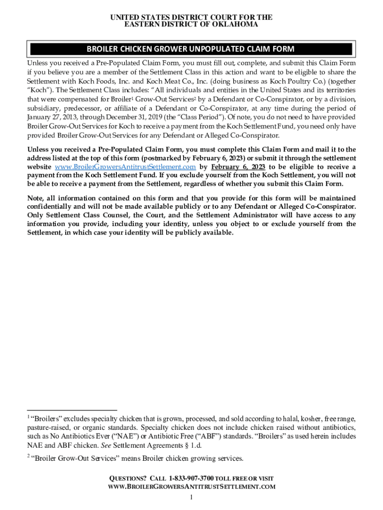 UNITED STATES DISTRICT COURT FOR THE EASTERN DISTRICT OF OKLAHOMABROILER CHICKEN GROWER UNPOPULATED CLAIM FORM Unless you received a PrePopulated Claim Form, you must fill out, complete, and submit