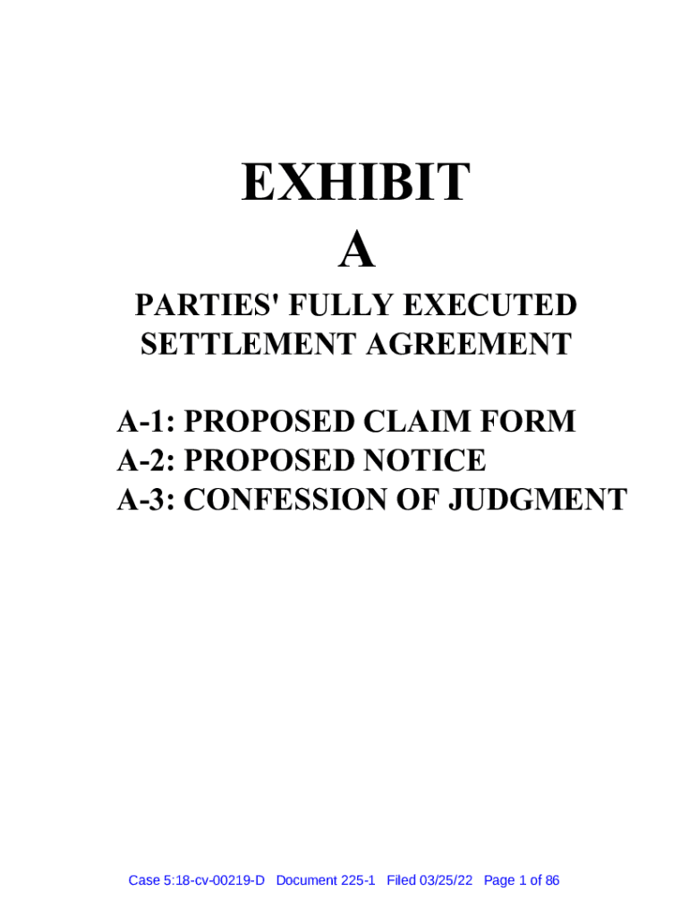 EXHIBIT PARTIES\' FULLY EXECUTED SETTLEMENT AGREEMENT A1: PROPOSED CLAIM FORM A2: PROPOSED NOTICE A3: CONFESSION OF JUDGMENT Case 5:18cv00219D Document 2251 Filed 03/25/22-Page 1 of 86PARTIES\' FULLY