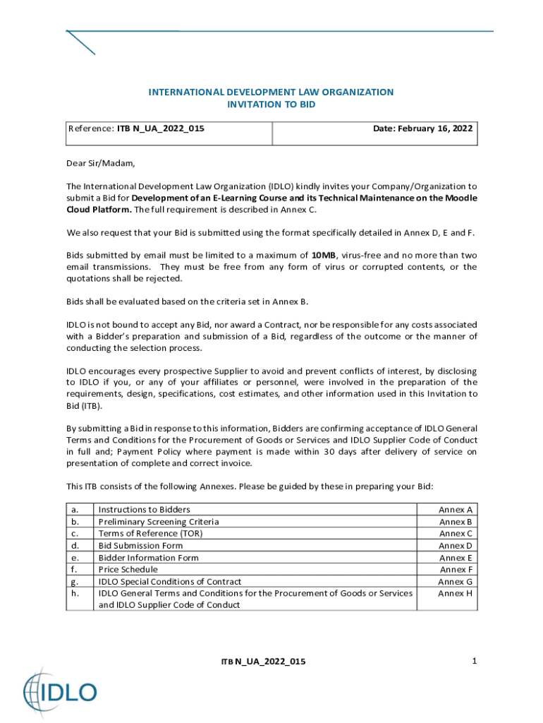 INTERNATIONAL DEVELOPMENT LAW ORGANIZATION INVITATION TO BID Reference: ITB N_UA_2022_015Date: February 16, 2022Dear Sir/Madam, The International Development Law Organization (IDLE) kindly invites