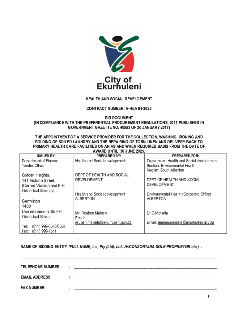 HEALTH AND SOCIAL DEVELOPMENT CONTRACT NUMBER: AREA 012023 BID DOCUMENT (IN COMPLIANCE WITH THE PREFERENTIAL PROCUREMENT REGULATIONS, 2017 PUBLISHED IN GOVERNMENT GAZETTE NO. 40553 OF 20 JANUARY 2017)