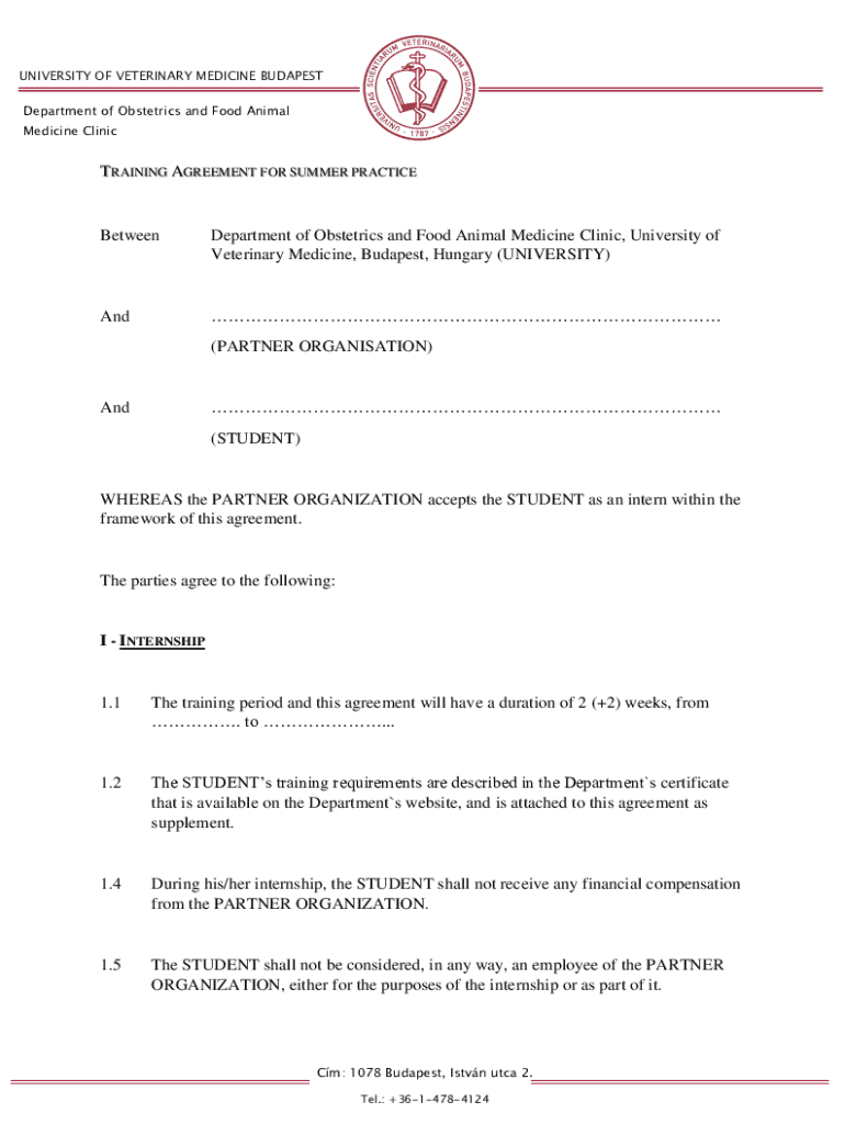 UNIVERSITY OF VETERINARY MEDICINE BUDAPEST department of Obstetrics and Food Animal Medicine ClinicTRAINING AGREEMENT FOR SUMMER PRACTICEBetweenDepartment of Obstetrics and Food Animal Medicine Clinic,
