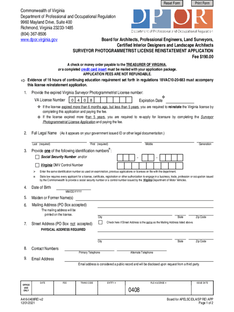 Dpor. virginia.gov Board for Architects Professional Engineers Land Surveyors Certified Interior Designers and Landscape Architects SURVEYOR PHOTOGRAMMETRIST LICENSE REINSTATEMENT APPLICATION Fee 190. Dpor. virginia.gov/dporweb/forms/fin/creditcard. pdf must be mailed with your application package. APPLICATION FEES ARE NOT REFUNDABLE. EVIDENCE OF COMPLIANCE WITH THE CONTINUING EDUCATION REQUIREMENTS SET FORTH IN REGULATION 18VAC10-20-683 EVIDENCE OF AT LEAST SIXTEEN HOURS OF BOARD APPROVED...