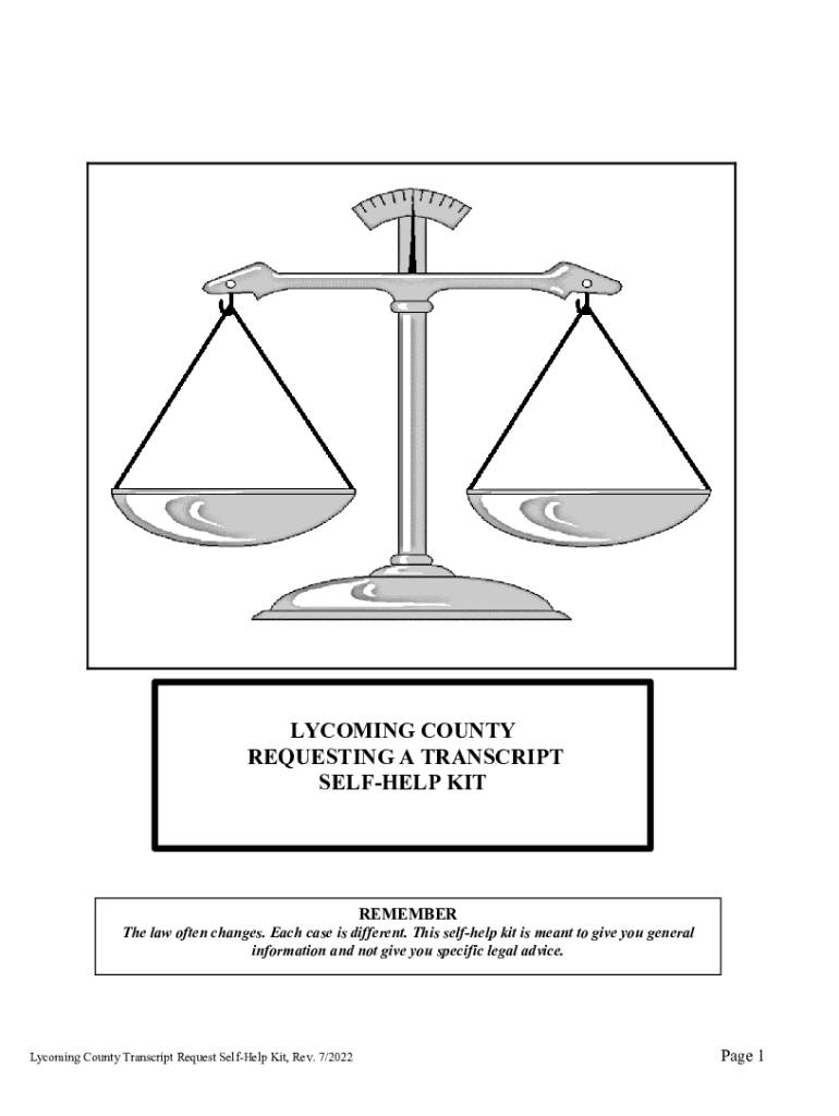 LYCOMING COUNTY REQUESTING A TRANSCRIPT SELFLESS KITREMEMBERThe law often changes. Each case is different. This self-help kit is meant to give you general information and not give you specific legal