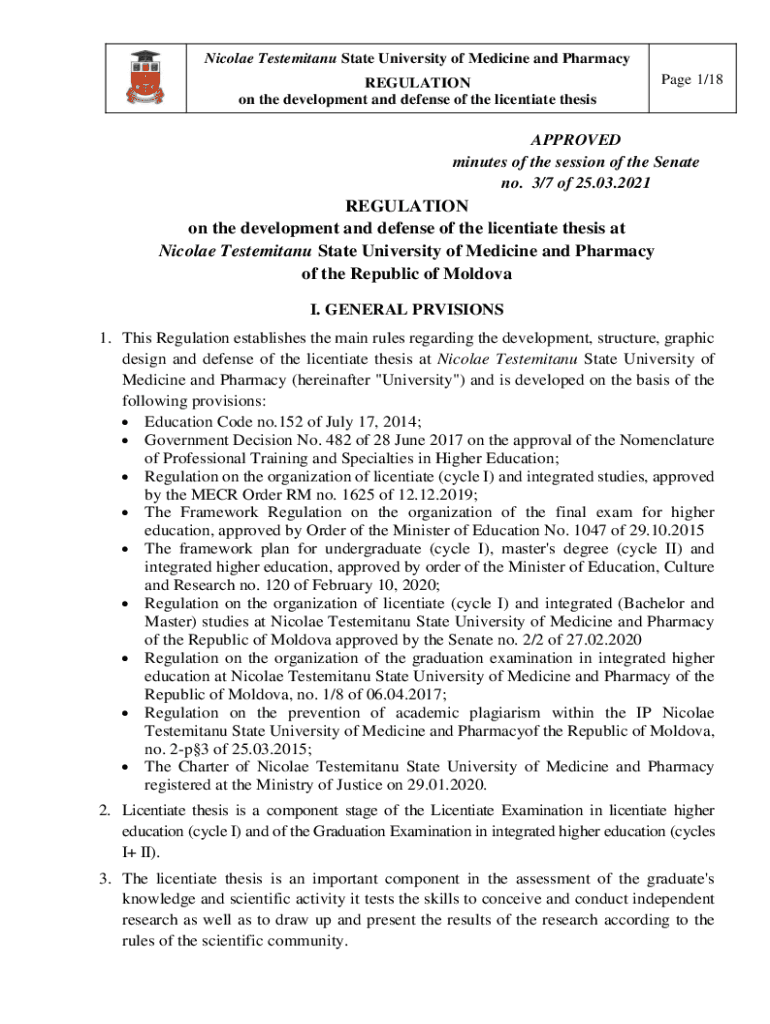 Nicolas Testemitanu State University of Medicine and Pharmacy REGULATION on the development and defense of the licentiate thesis Page 1/18APPROVED minutes of the session of the Senate no. 3/7 of 25.03.2021REGULATION