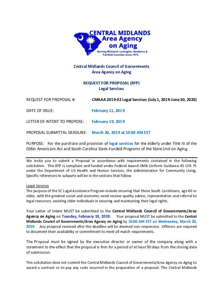 REQUEST FOR PROPOSAL #:CM AAA 201902 Legal Services (July 1, 2019June 30, 2020)DATE OF ISSUE:February