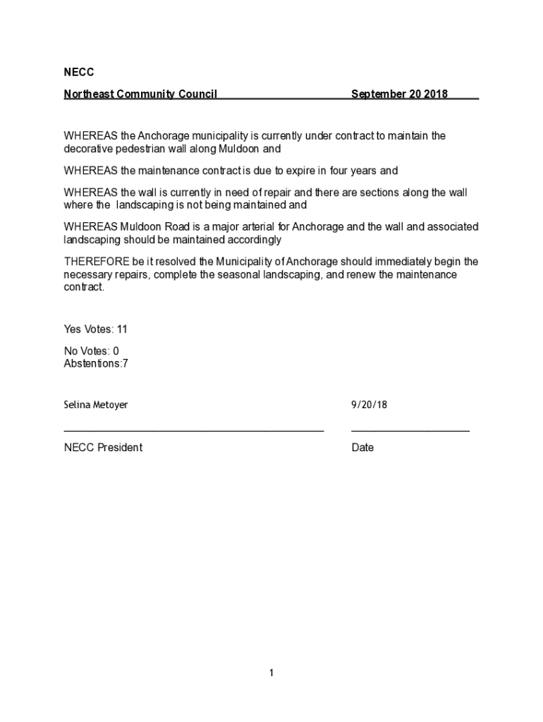 NECK Northeast Community Council September 20 2018WHEREAS the Anchorage municipality is currently under contract to maintain the decorative pedestrian wall along Mildew and WHEREAS the maintenance
