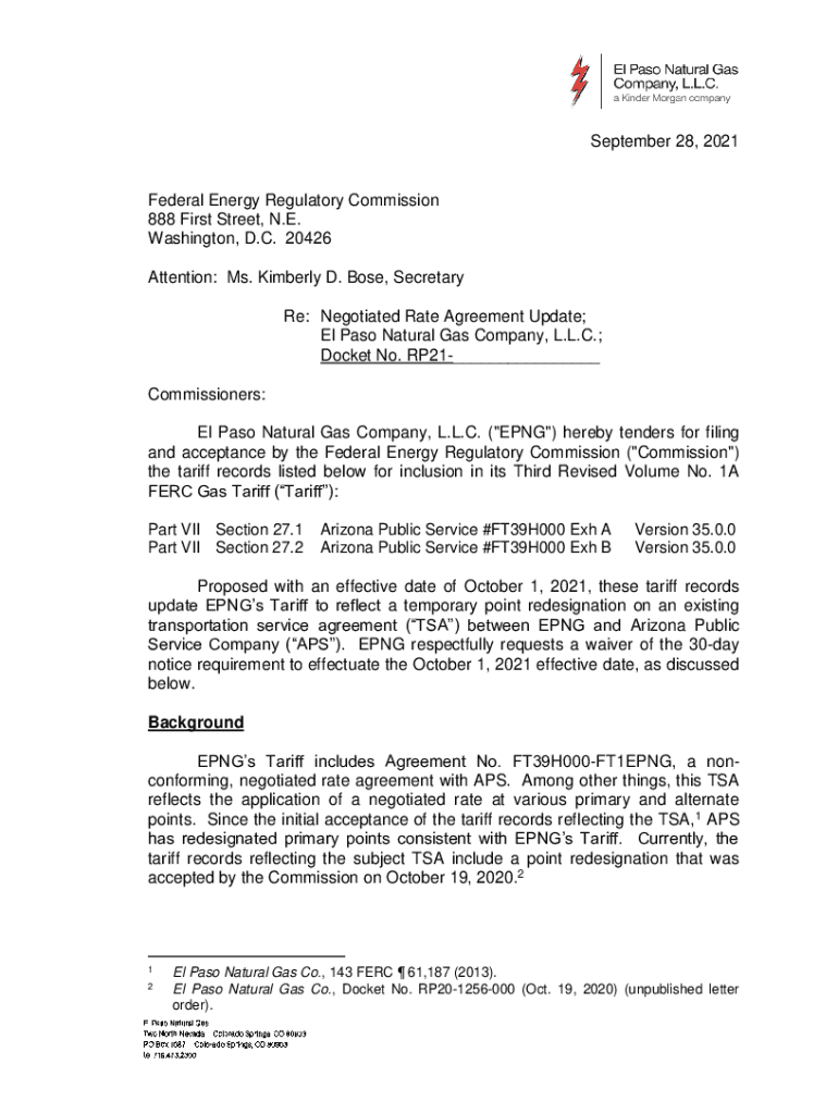 September 28, 2021Federal Energy Regulatory Commission 888 First Street, N.E. Washington, D.C. 20426 Attention: Ms. Kimberly D. Bose, Secretary Re: Negotiated Rate Agreement Update; El Paso Natural