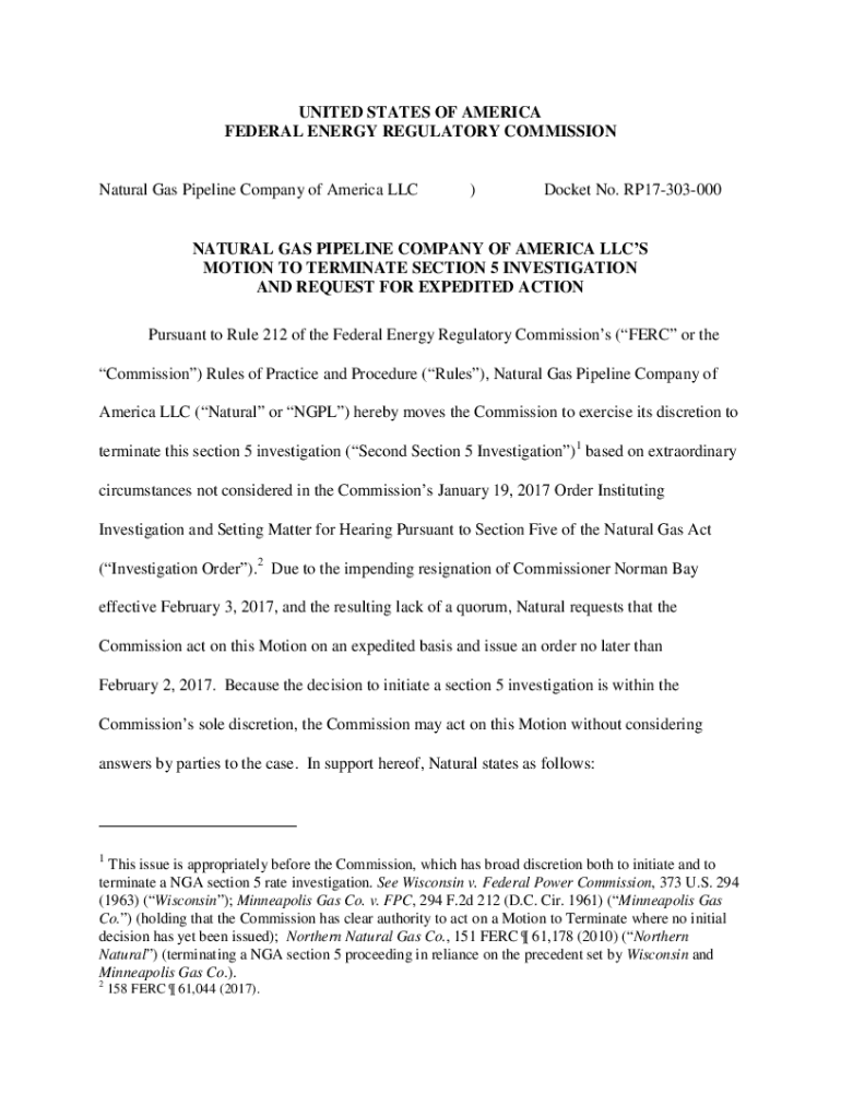 UNITED STATES OF AMERICA FEDERAL ENERGY REGULATORY COMMISSION Natural Gas Pipeline Company of America LLC)Docket No. RP17303000NATURAL GAS PIPELINE COMPANY OF AMERICA LCS MOTION TO TERMINATE SECTION