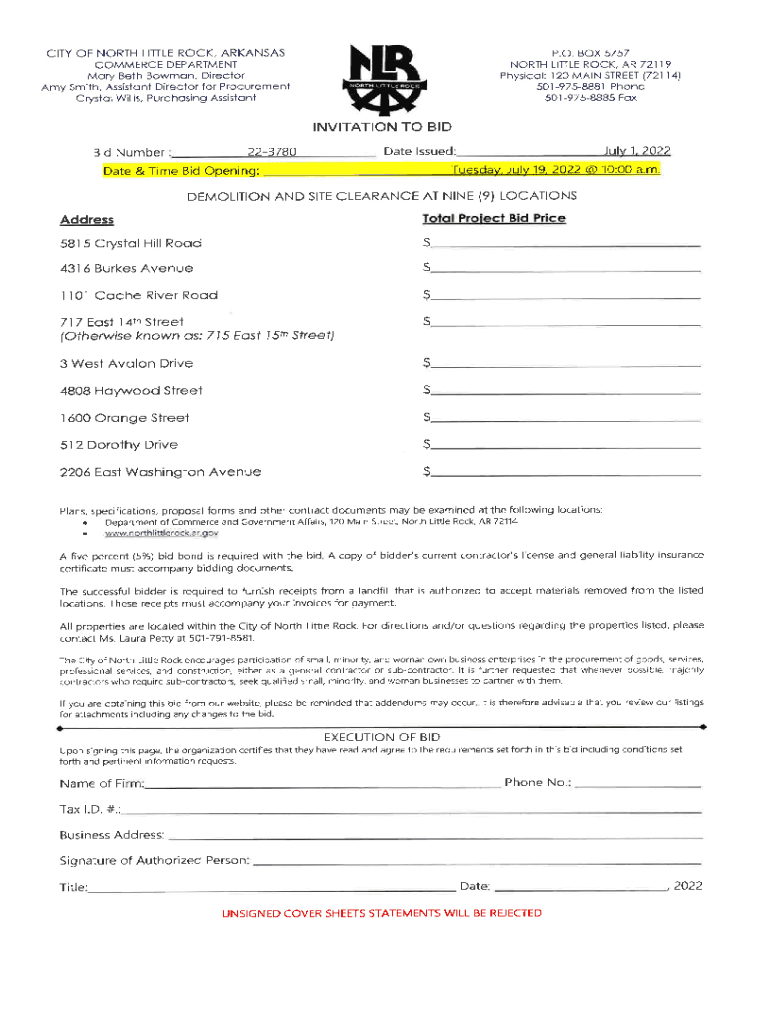 CITY OF NORTH LITTLE ROCK, ARKANSAS COMMERCE DEPARTMENT More Beth Bowman, Director Amy Smith, Assistant Director for Procurement Crystal Willis, Purchasing Assistant. O. BOX 5757 NORTH LITTLE ROCK,